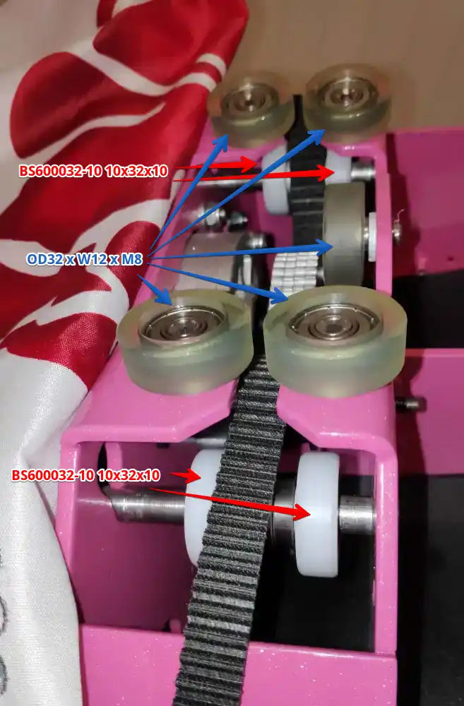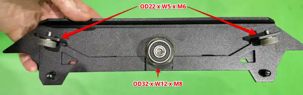 - If you've had issue with PU cover separating from original bearings, optionally replace rear two rollers with 8x32x12 mm POM Coated Rollers which will also each require a M8x15x2 washer and M8x18mm Black Hex Hexagon Socket Button Head Bolt
